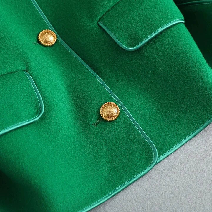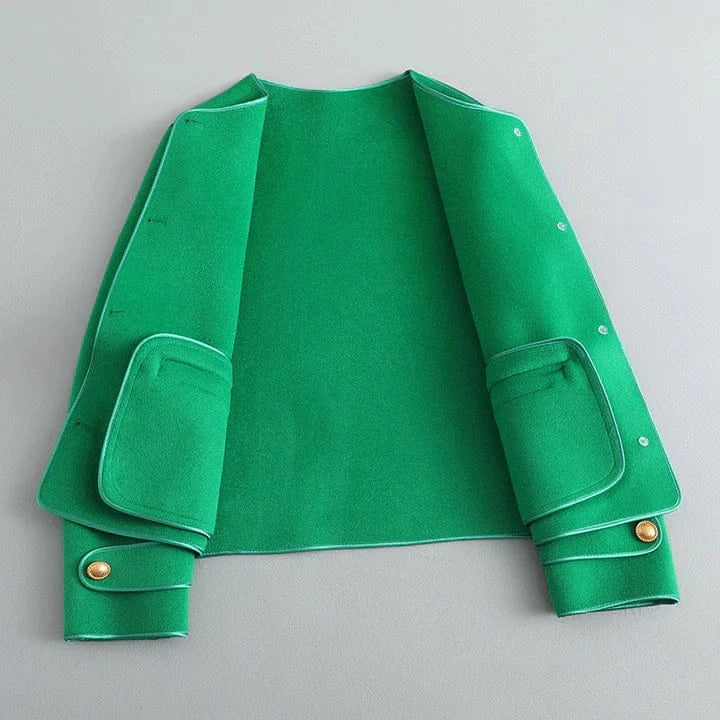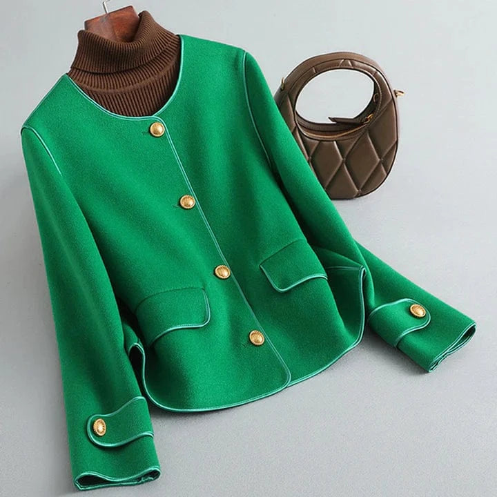 Wool, elegantly honed. Featuring a tailored cut with minimalist lines and a lightly structured frame, this jacket brings graceful precision to everyday wear. Its gleaming accents offer a subtle contrast, perfect for the woman who masters balance.