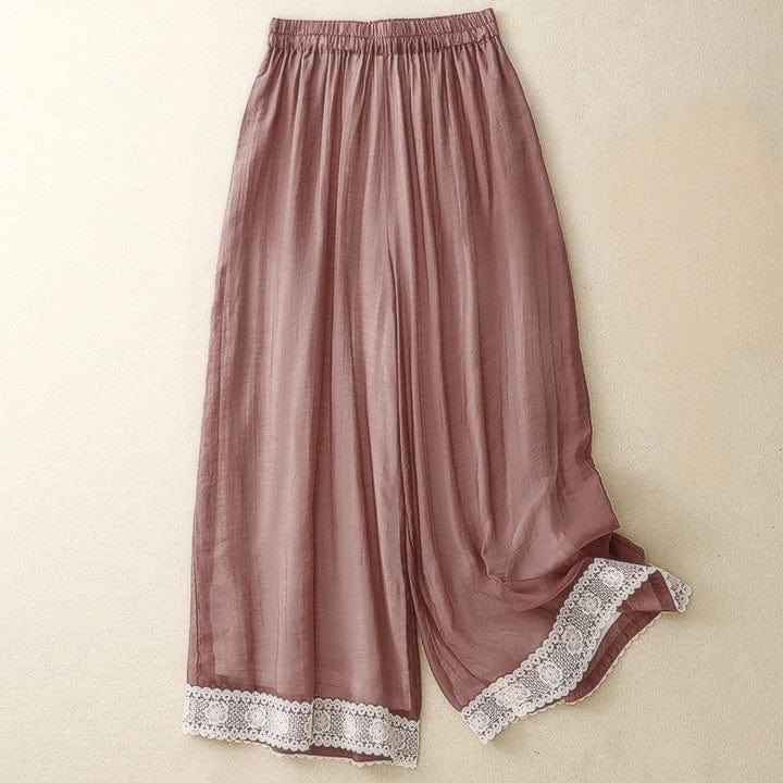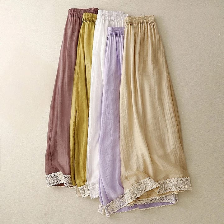 Spun from whisper-light gossamer linen, these pants channel a vintage reverie with delicate lace trimming the hem. A flowing silhouette invites barefoot mornings and twilight strolls, crafted for those who collect moments as artfully as they dress.