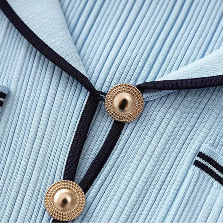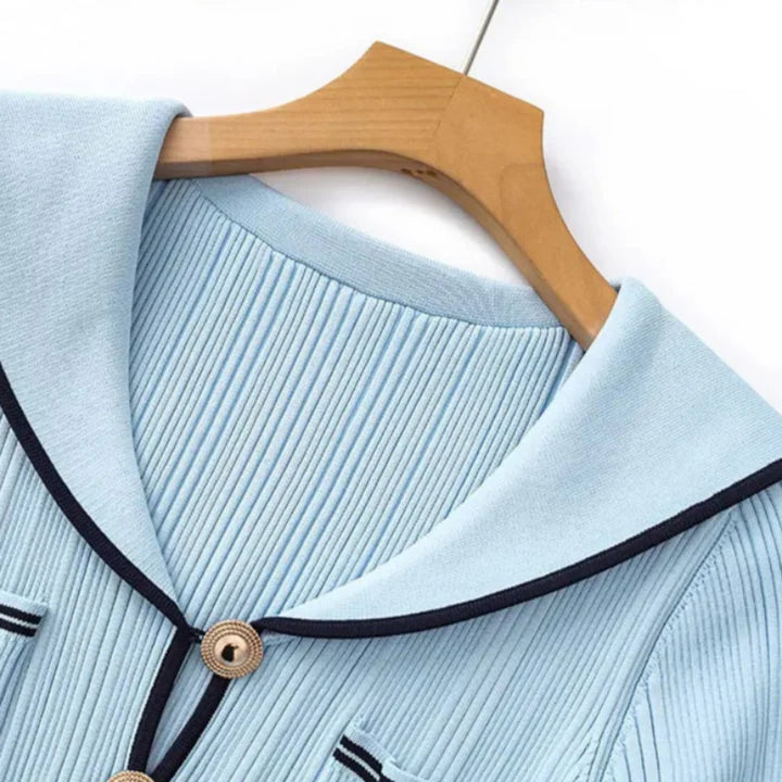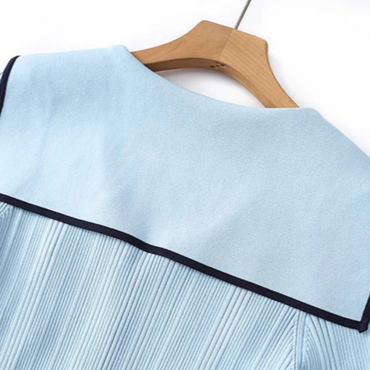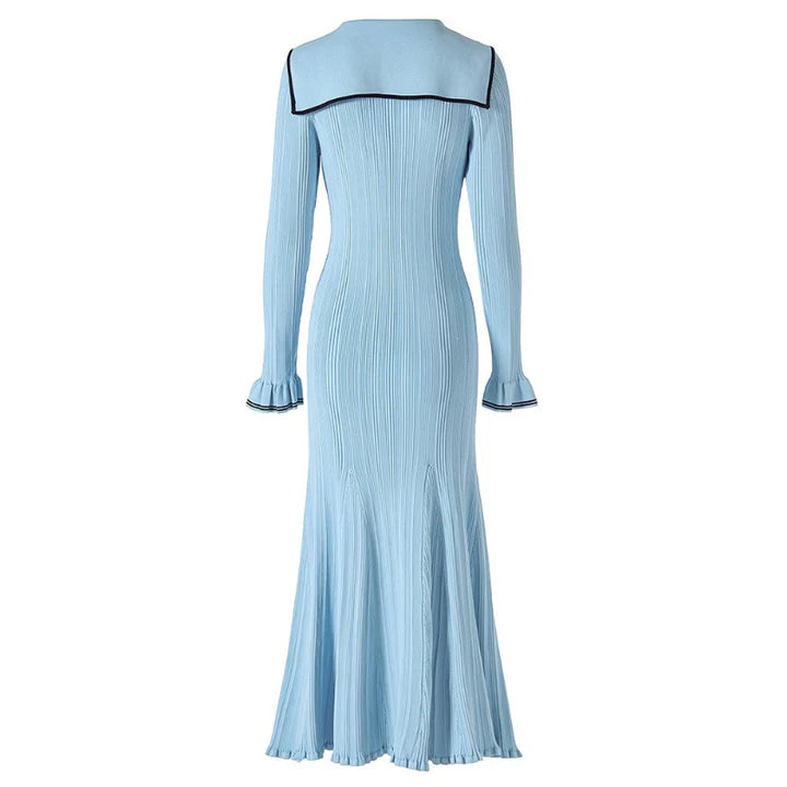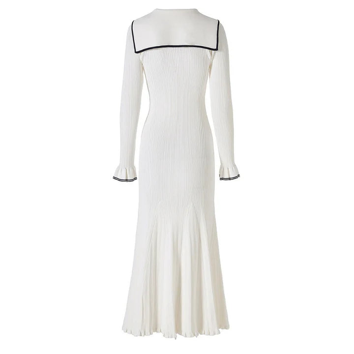 A nod to retro maritime flair, reimagined for the modern muse. This body-contouring knit dress plays with proportion: a sharp collar meets soft curves, while the fishtail hem adds motion to every step. Style with oversized earrings and low boots for a distinctly urban attitude.