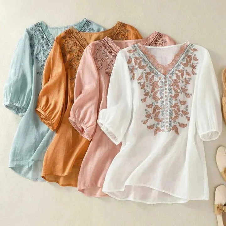 Crafted from our exclusive Gossamer linen, this blouse blooms with embroidery along a gentle V-neck. Lace tracing the neckline and gathered half sleeves lend softness—stitched for slow days and shaded strolls.