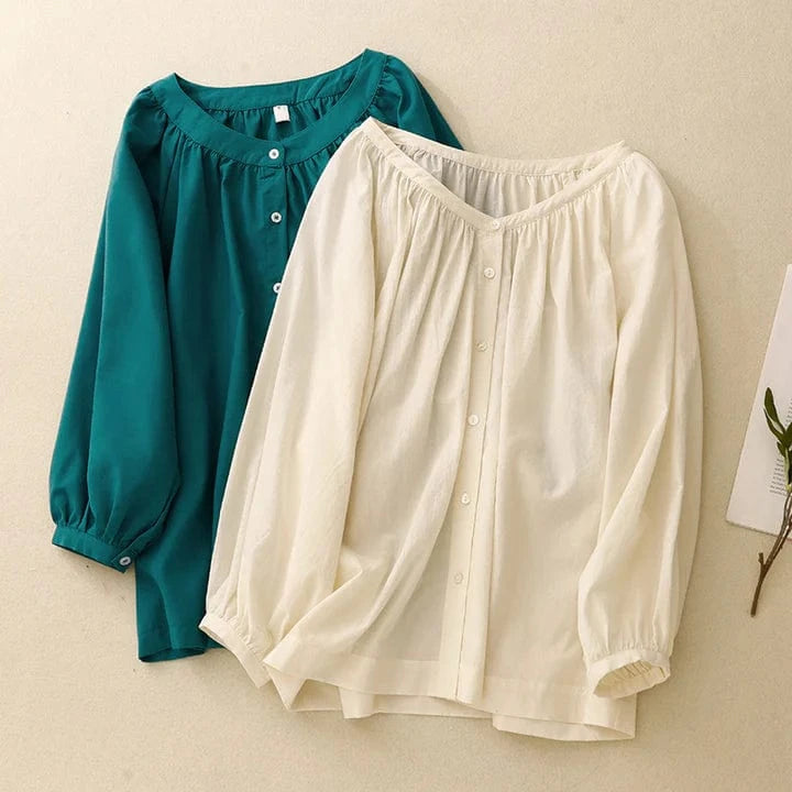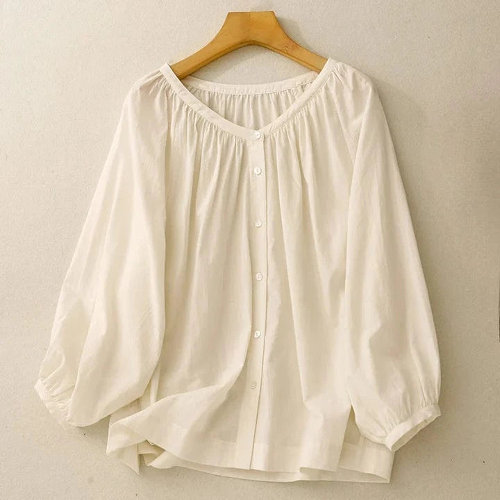 Crafted from airy linen, this blouse sways with a gathered neckline and airy three-quarter sleeves. A line of delicate buttons runs down the front—an easy rhythm for slow mornings and soft breezes.