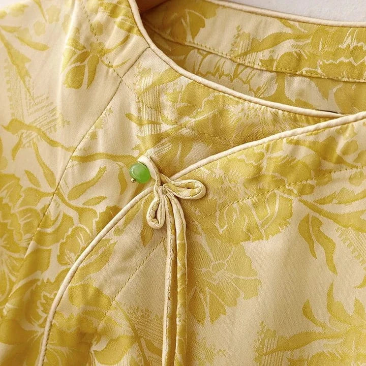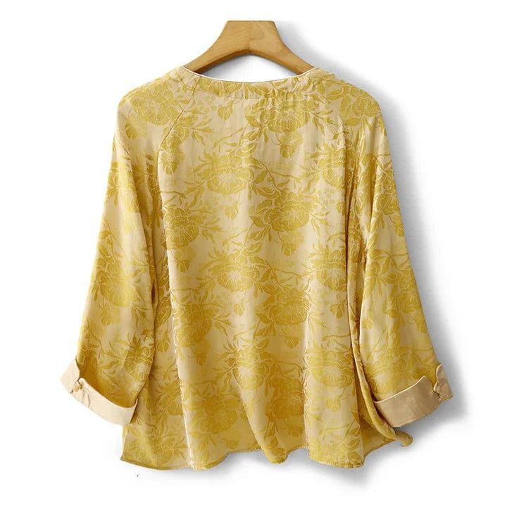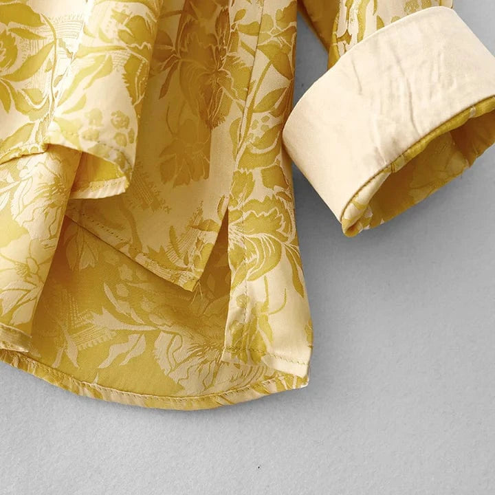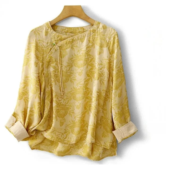 Woven from whisper-light gossamer linen, this blouse paints a subtle portrait of vintage charm and artisanal grace. The softly sculpted neckline gathers with an off-center tie, tracing delicate asymmetry across its floral jacquard. Billowed sleeves taper into a gentle cuff, inviting a poetic rhythm to each movement.