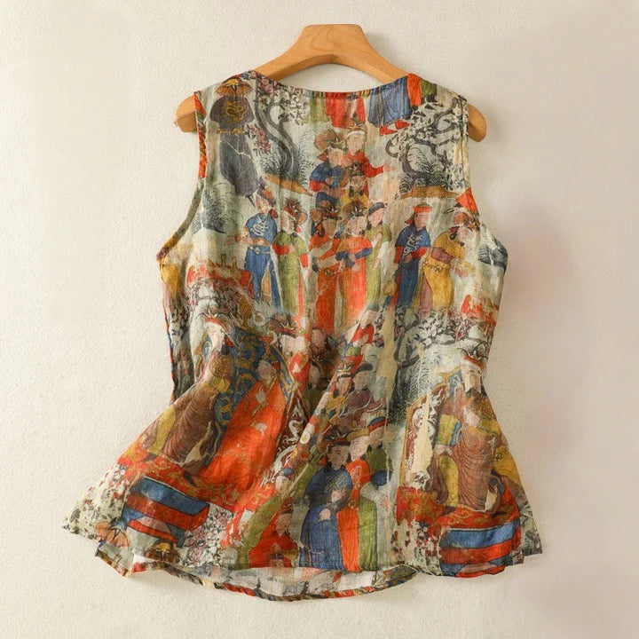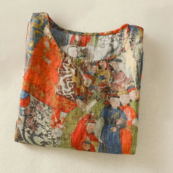 An ode to artistry, this linen top carries a rich, hand-rendered tableau across its airy frame. The gossamer weave drapes with a gentle ease, while its intricate scene — alive with color and narrative — invites the gaze to linger.