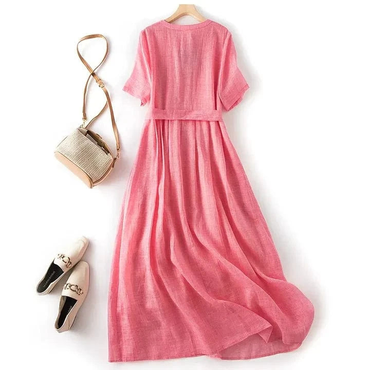 Spun from airy gossamer linen, this dress captures the movement of light and breath. The softly structured bodice flows into a full skirt, while a row of side-set buttons and a sculptural waist tie echo artisanal precision. Designed for moments that linger beyond the hour.