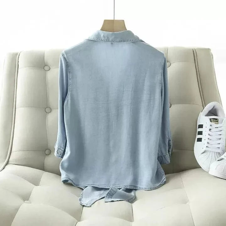 A study in understated elegance, this button-down shirt flows with natural ease. A soft tie hem offers shape without structure, while roll-tab sleeves lend utility to its breezy intent. For weekends spent lingering in cafés or catching light between the leaves.