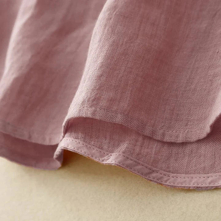 Crafted from linen, this blouse flows with a soft V-neckline and a four-button placket. Slight gathers at the collar and rolled sleeves bring a quiet charm—stitched for slow days and sunlit ease.