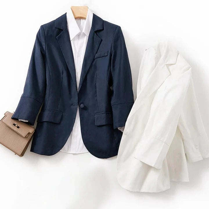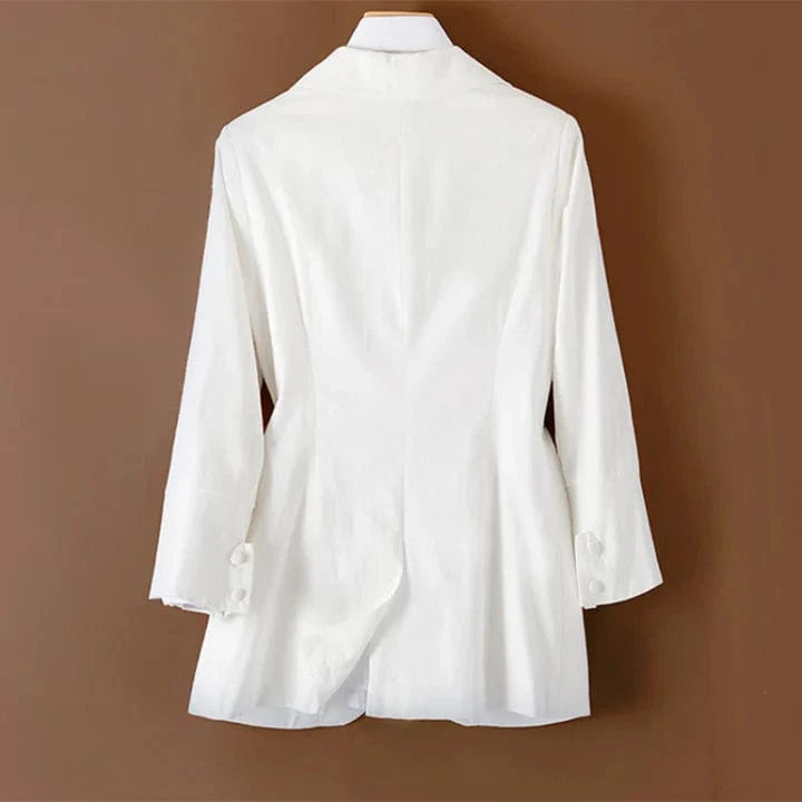 Rendered in Gossamer linen for its breathable texture and soft resilience, this blazer brings structured grace to warmer seasons. Cut with a slim notch lapel, gentle curve at the hem, and button-front closure, it’s a study in light tailoring—made to drift seamlessly from polished moments to relaxed refinement.