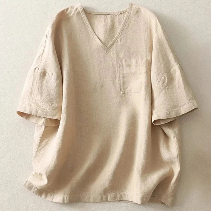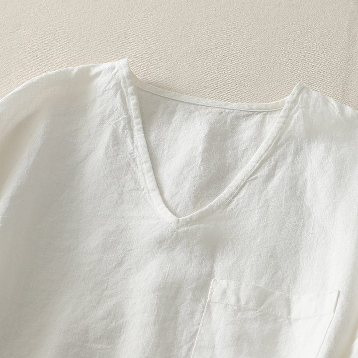 Spun from airy gossamer linen, this shirt embodies effortless minimalism. The soft drape, clean V-neckline, and delicate pocket detail craft a silhouette of pure, understated elegance—perfect for sunlit days and quiet evenings alike.