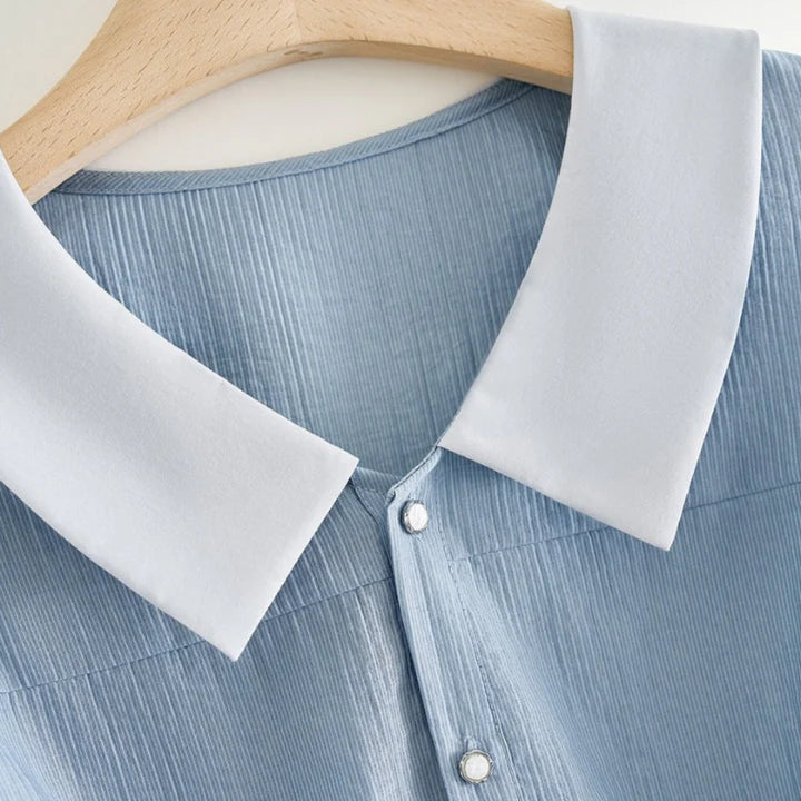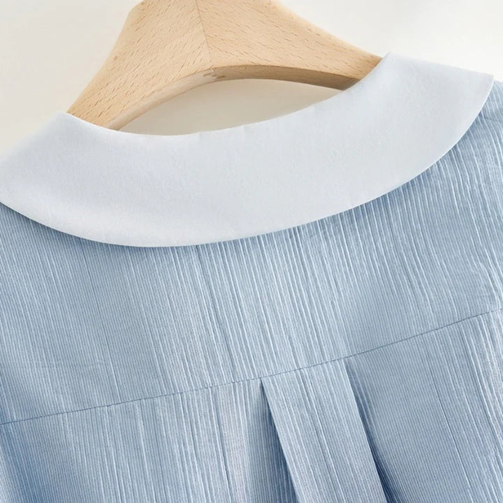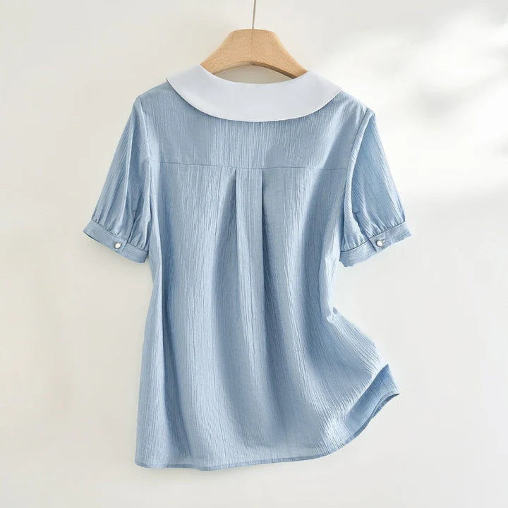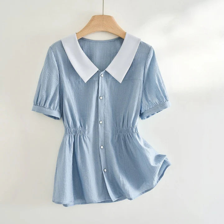 Framed with a crisp contrast collar, this blouse captures quiet charm through fine pleats and softened volume. A gently cinched waist gives shape to the silhouette, while pearl-like buttons and puff sleeves whisper of past eras reimagined for today.