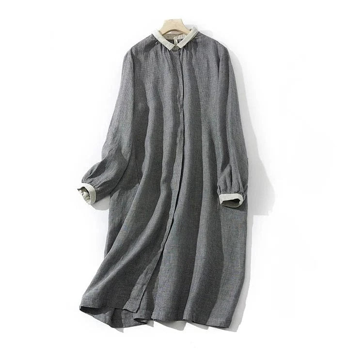 Woven from featherlight gossamer linen, this dress drapes with understated grandeur. A softly gathered collar and voluminous sleeves echo a quiet romanticism, while its flowing silhouette moves with the grace of a passing breeze—meant for days that unfold slowly.