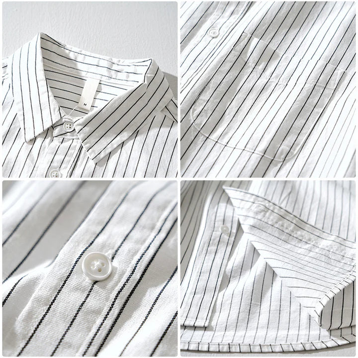 Soft vertical stripes meet crisp tailoring in this Gossamer Linen shirt. Designed for comfort, built for versatility—wear it open, tucked, or layered, season after season.