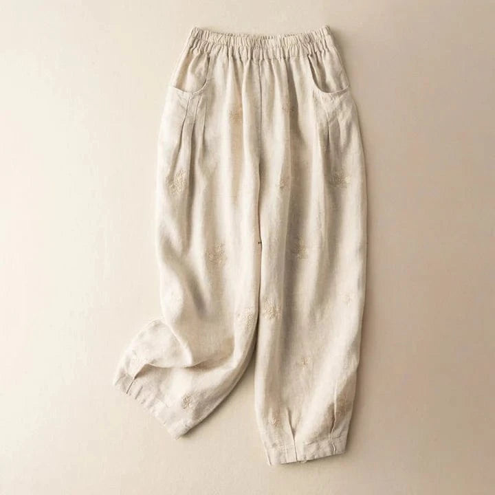 Woven from featherlight Gossamer linen, these trousers bloom with tonal embroidery—subtle as pressed petals on parchment. The shape: easy, relaxed, and quietly rare.