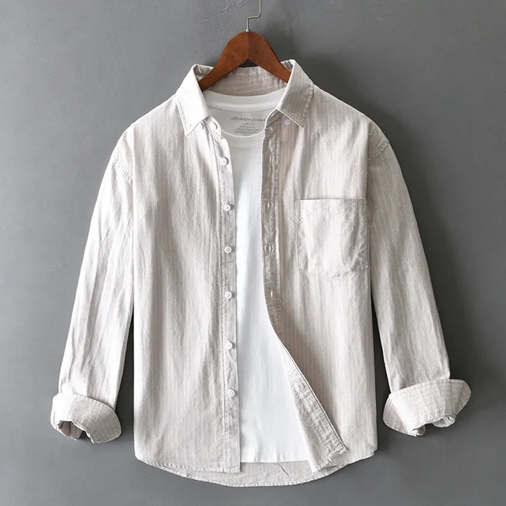 Pure linen meets fine vertical lines—this piece blends casual spirit with quiet precision. Designed for days that flow with ease, its laid-back cut and soft texture carry the rhythm of comfort with each movement.
