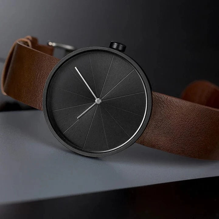 A study in restraint, this watch distills timekeeping to its raw essence. The minimalist dial is intersected by finely engraved lines, creating an interplay of movement and stillness, anchored by a strap cut from full-grain leather—renowned for its rich texture and ability to patina over time, deepening in character with each wear.