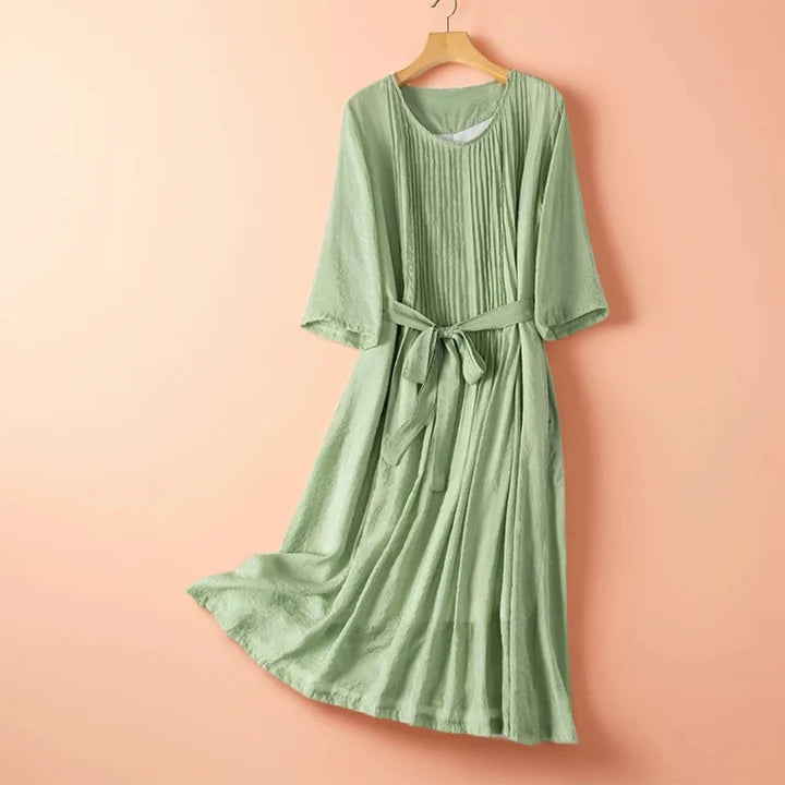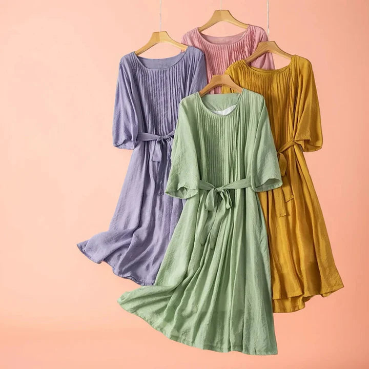 Woven for breath and movement, this linen dress draws from vintage notes—pleated bodice, ribboned waist, and a hem that brushes the air. Designed to fall softly yet hold its form, it's a silhouette that whispers femininity without insistence.