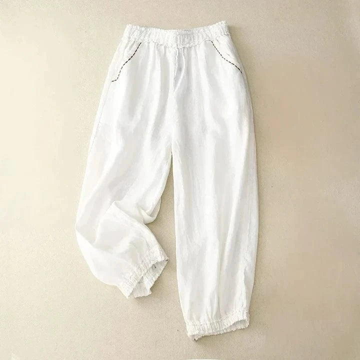 Crafted from cloud-soft gossamer linen and finished with a touch of vintage lace at the hem, these trousers evoke slow days and simpler times. The pull-on waist and balloon silhouette feel like home wherever you go.