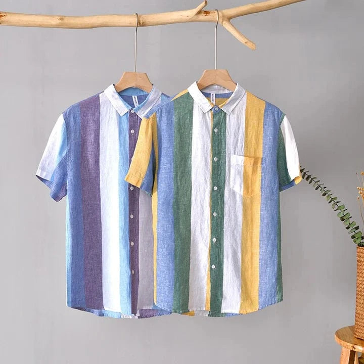 Spun from gossamer linen, this shirt drapes in painterly vertical strokes, evoking a breezy cadence of sky and stillness. The lightweight weave whispers against the skin, while the contrast placket and button details ground the look in structure. Designed to blur the line between statement and staple.