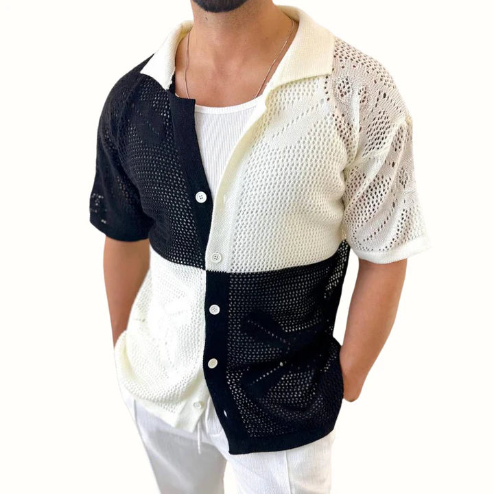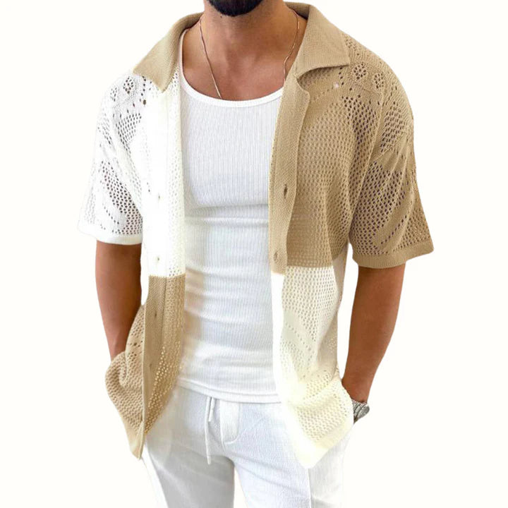 Featuring color-contrast patches, the Casa Milo shirt is crafted from a uniquely textured cotton blend. Its hollow mesh and intricate open-knit design resemble pique, offering breathability without being overly sheer—perfect for catching a little extra breeze.