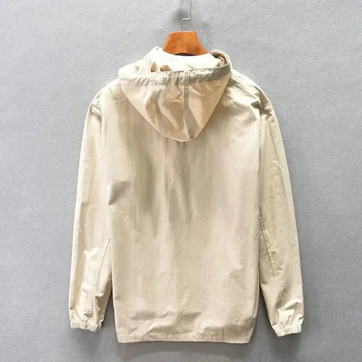 A light layer for shifting skies, cut in quiet lines and soft movement. The hood rests easy, the zip glides smooth — built for mornings that drift into dusk.