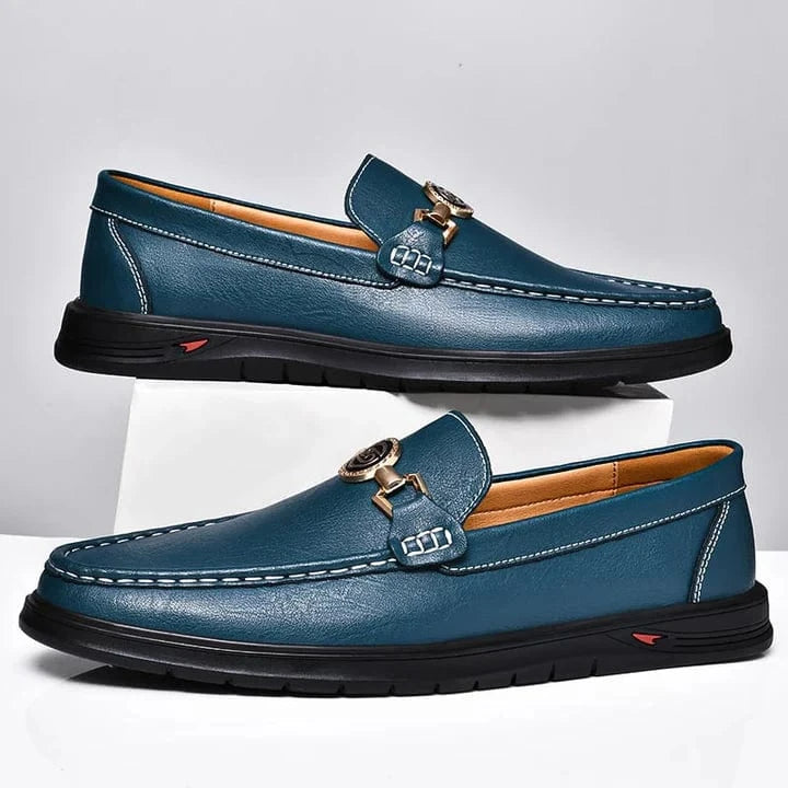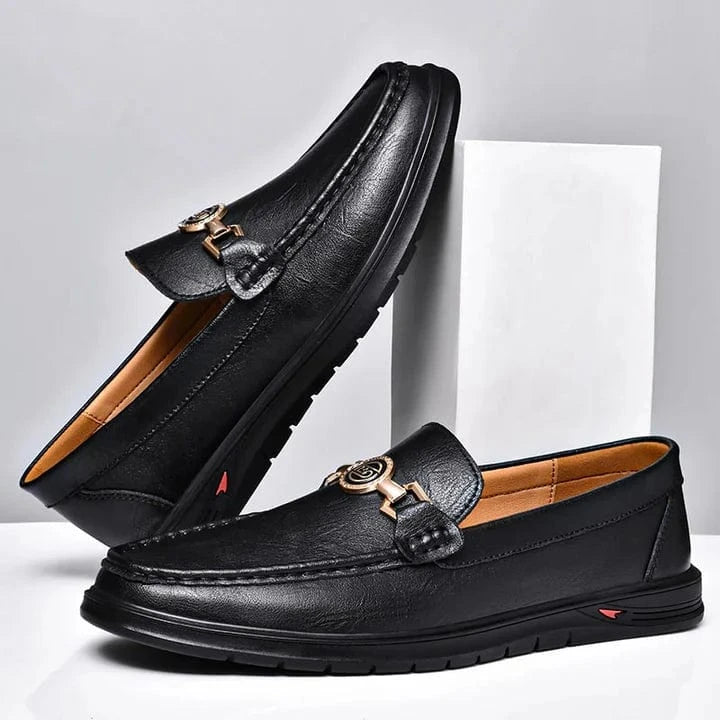 Accentuated by a striking golden front embellishment and crafted from genuine Italian leather, these loafers envelop your feet in luxurious comfort. The cushioned insole provides exceptional comfort, while the durable outsole offers reliable grip throughout the day.