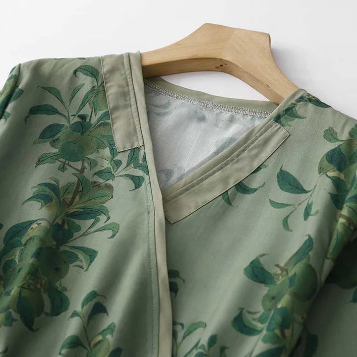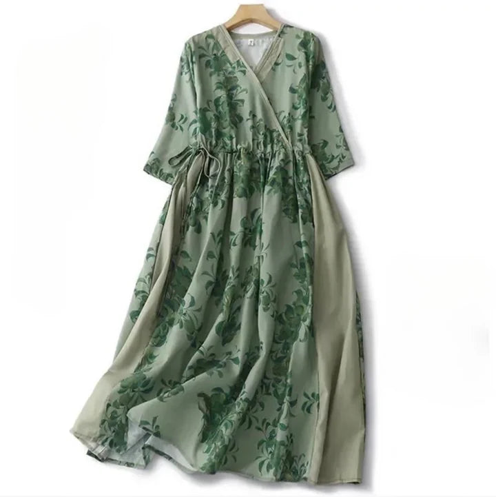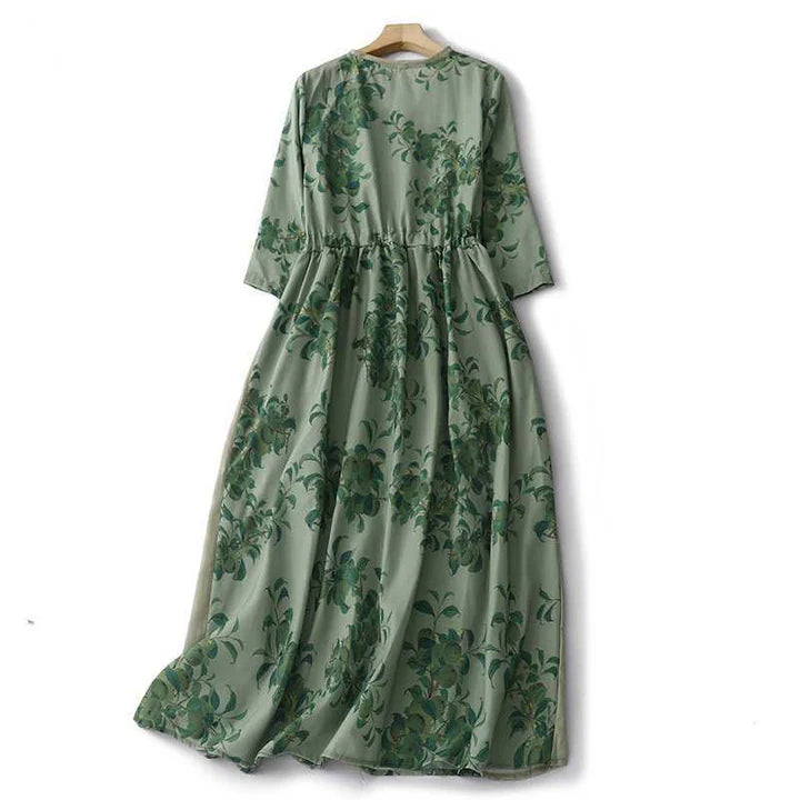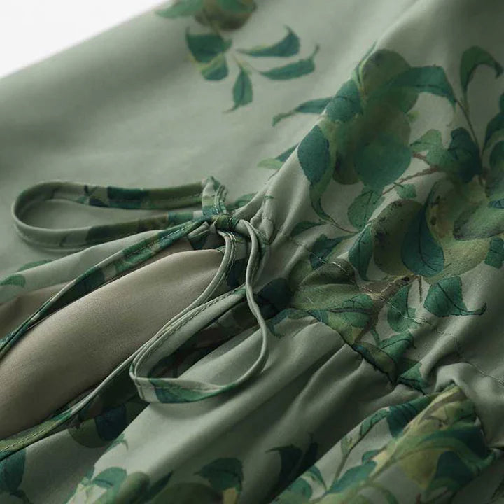 Embrace the art of relaxed elegance with this exquisite linen dress, a testament to unhurried sophistication. Crafted from the finest natural fibers, its ethereal drape and verdant botanical print evoke the tranquility of a hidden garden.