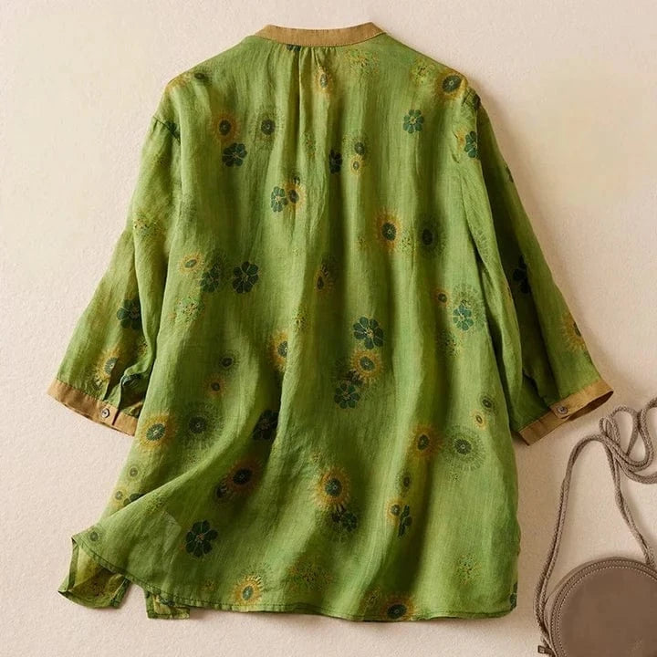 Woven from our featherlight Gossamer linen, this blouse carries an earthy calm through its gentle drape and standing collar. Subtle gathers and a flowing hem lend ease to its form—stitched for quiet moments and layered light.
