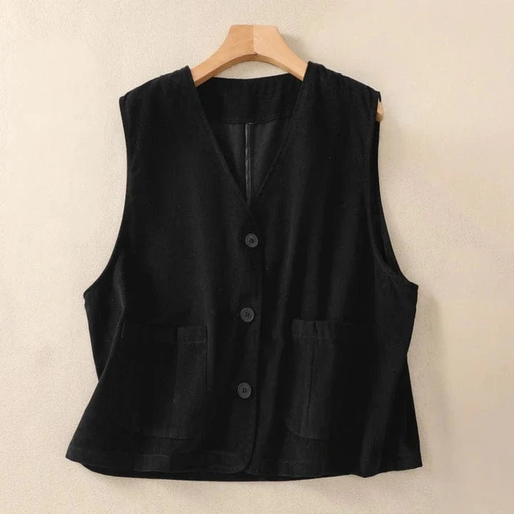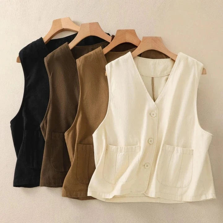 Soft structure meets artisan spirit in this gossamer linen vest, rendered with raw simplicity and quiet charm. With deep patch pockets and a sculpted V-neckline, it’s the piece you layer when stories are being written in linen and light.