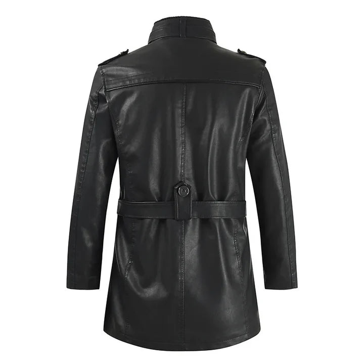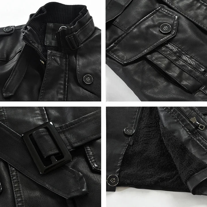 Crafted from premium leather, our Dexter jacket offers durability and comfort with a zippered chest pocket, fleece-lined interior, belt closure, and stand-up collar—a true masterpiece of leather craftsmanship.