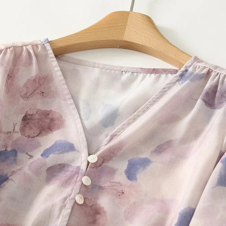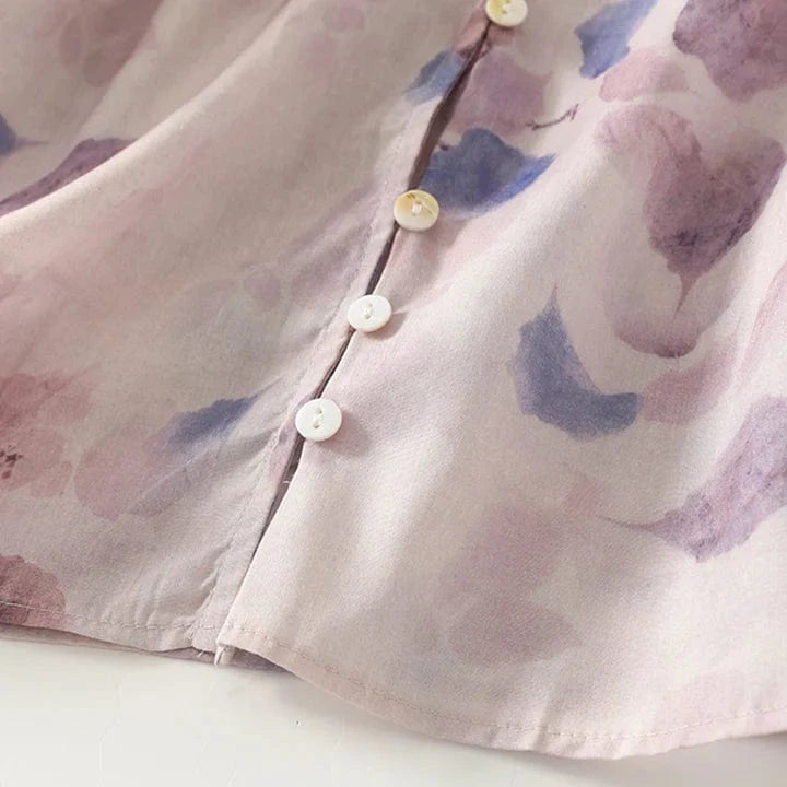 Woven in gossamer-light linen, this blouse moves like watercolor on skin. A cascade of delicate buttons trails the front, drawing the eye through its airy rhythm. The gathered sleeves and abstract print evoke a dream in motion—gentle, slow, and endlessly artful.