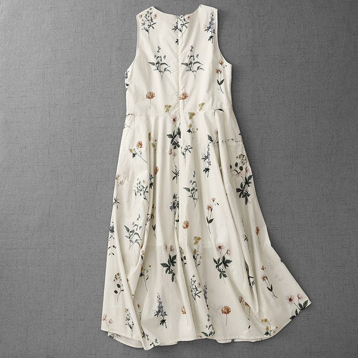 Woven from gossamer linen, this sleeveless dress captures the quiet poise of a morning garden. Hand-drawn florals bloom across a flowing silhouette, softening every step with a whisper of motion. Designed for days when presence is a quiet kind of beauty.
