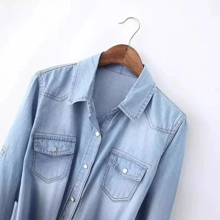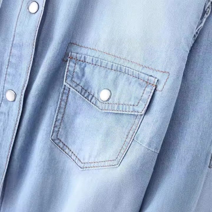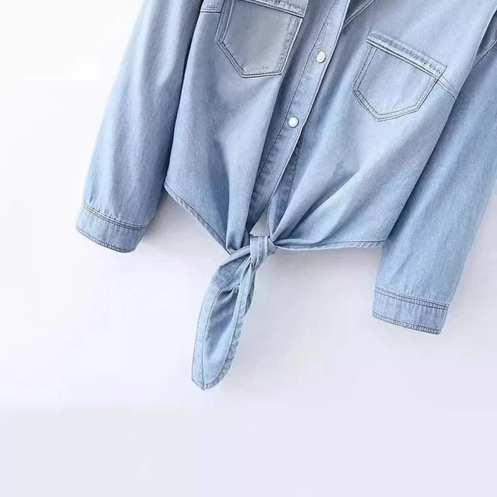 A nod to vintage workwear, reimagined for today. This denim tie-front shirt boasts crisp lines, flap chest pockets, and a silhouette that gathers at the waist with just the right cinch. Wear it open over a sundress or buttoned for a sculpted finish—its versatility is only matched by its charm.