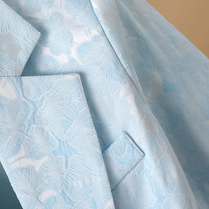A tailored study in texture and restraint, this blazer fuses architectural shape with intricate surface. The tonal floral motif emerges softly from the fabric, offering a quiet opulence that’s more whispered than declared.