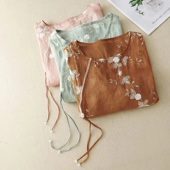 Airy yet intentional, this gossamer linen blouse floats with graceful asymmetry. Intricate floral embroidery climbs across its surface, catching the light in soft, deliberate whispers. A quiet indulgence for those who understand that beauty lives in nuance.