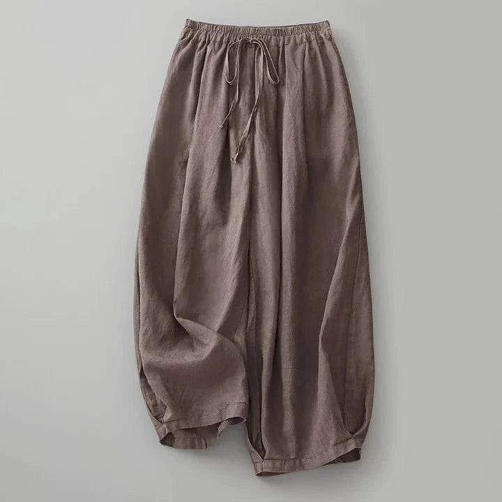 Woven from extra airy linen, these lantern pants drift with a soft silhouette and gathered cuffs. An elastic waist with tie detail offers a flexible fit—stitched for quiet days and open skies.