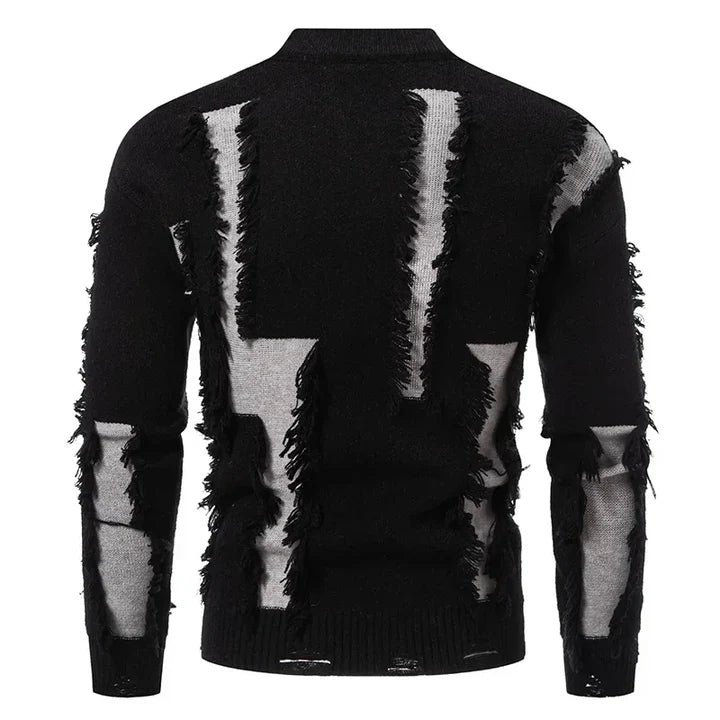 Woven with a spirit of defiance, this sweater tells a story of rebellion through its intricate distressed patterns and daring textures, evoking strength and individuality in every thread.