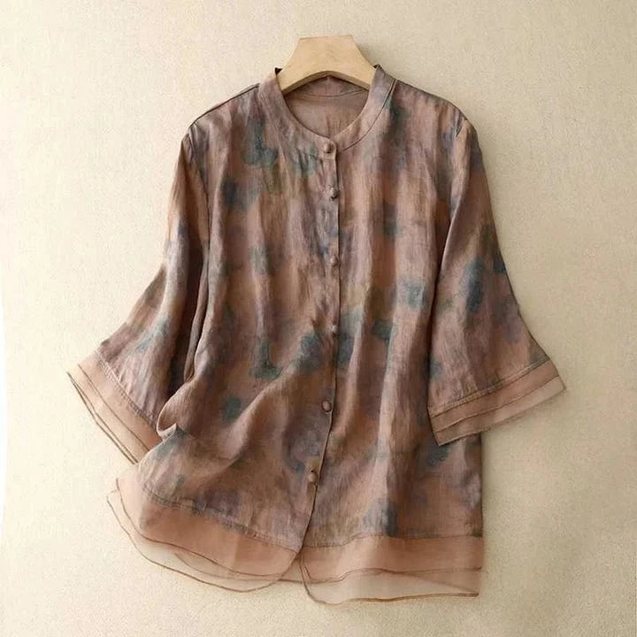 A luminous whisper of linen, cut to invite light and movement. The floral motif, equal parts dream and delicacy, is layered with tonal sheerness for depth without weight. The silhouette flows freely with soft pleats and a quiet mandarin neckline—perfect for moments that ask for ease and elegance in equal measure.