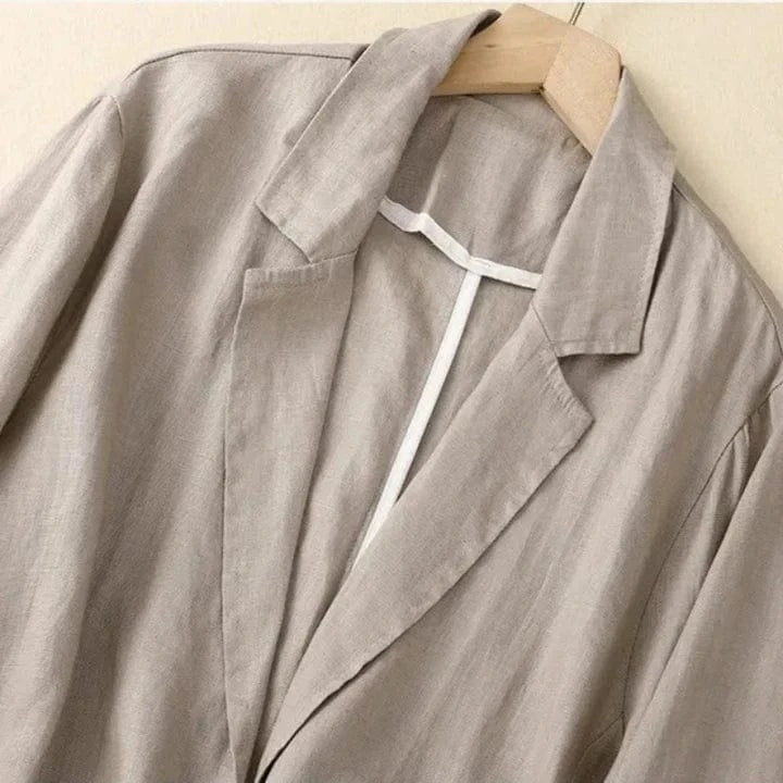 Crafted from our signature Gossamer Linen, this blazer captures the airiness of summer with tailored restraint. The easy drape and clean single-button closure offer a quiet elegance that moves effortlessly from weekday to weekend.
