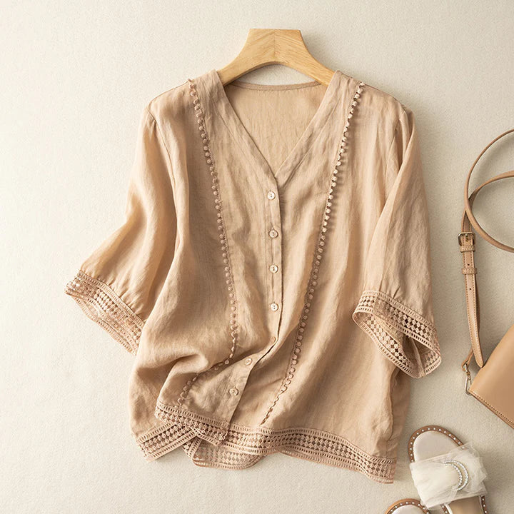 Crafted from whisper-thin Gossamer Linen, this blouse feels like sunlight against the skin. Crochet trim and soft pleats add dimension to a silhouette made for meandering days and breezy balconies.