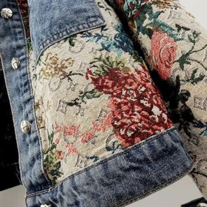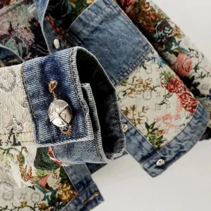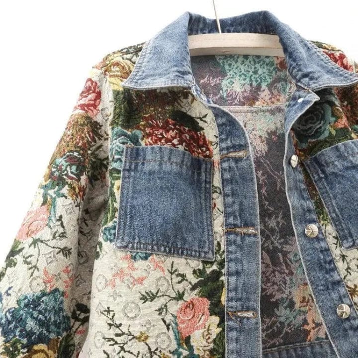 Vintage denim meets delicate floral tapestry in the Hayley Jacket, blending soft romanticism with nostalgic charm. The intricate flowers bloom against the worn denim, creating a jacket that captures both retro elegance and trendy design.