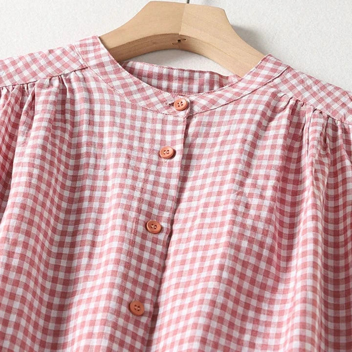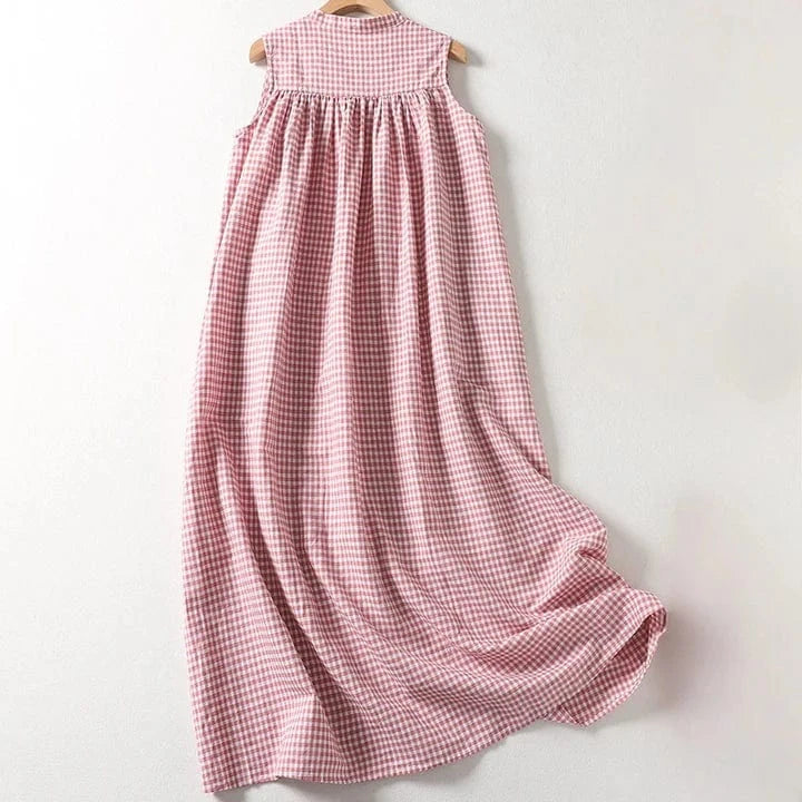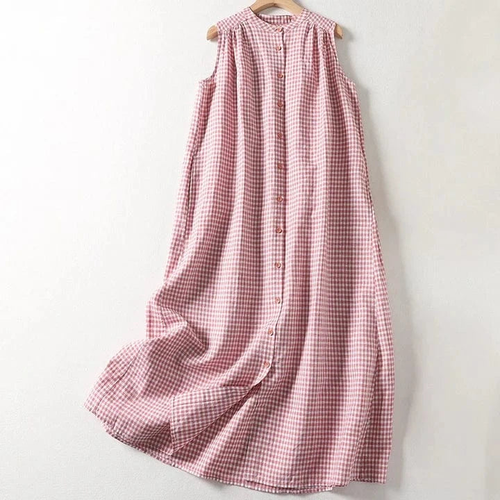 Spun from breathable linen, this sleeveless button-down dress captures the grace of slow mornings and countryside strolls. A classic gingham weave sways gently with movement, while pleated shoulders lend a quiet romance—designed for sunlit pauses and stories softly told.