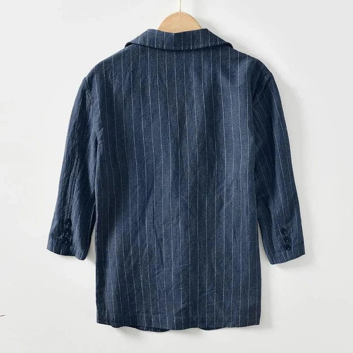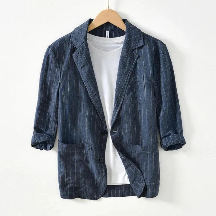 Tailored from breathable cotton-linen, this striped jacket brings quiet character to your look. The rolled sleeves hint at ease, while the notched lapel and structured cut keep things grounded.