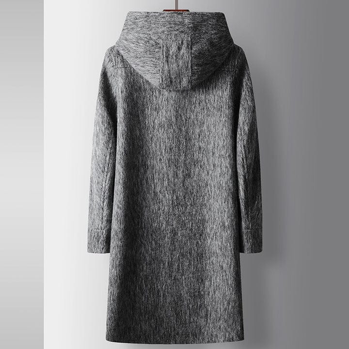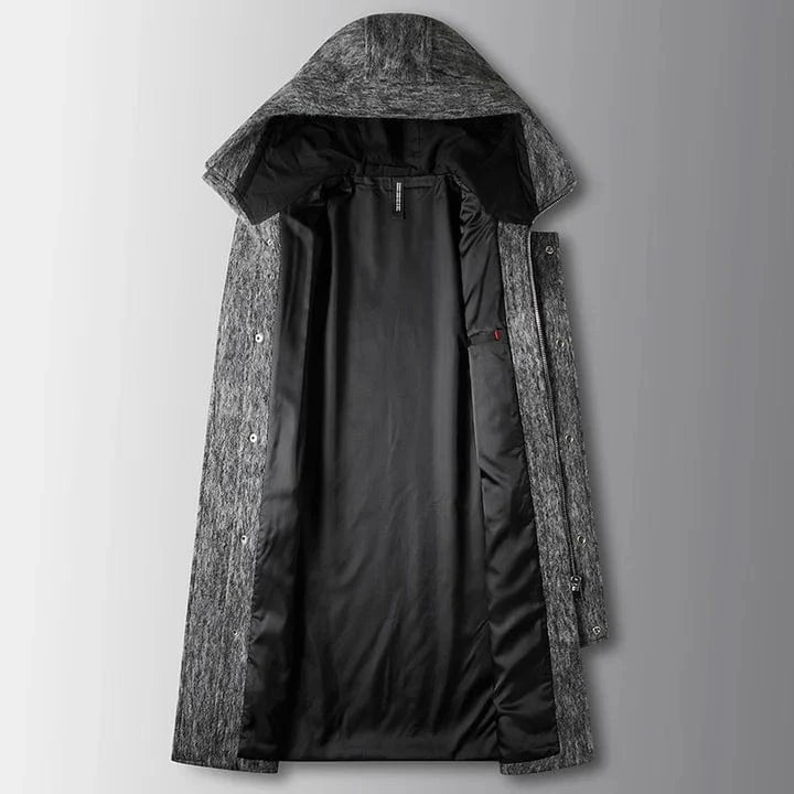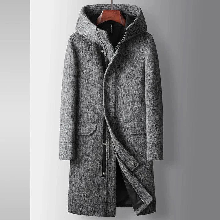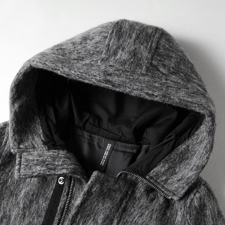 Forged from heavyweight wool, this hooded coat is a fortress against the cold. Its structured silhouette and thermal lining offer unparalleled warmth, blending function with an effortless edge.