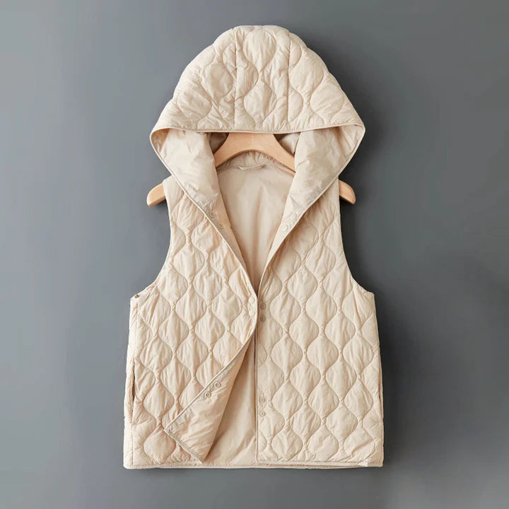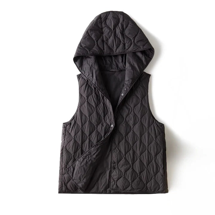 A soft shield against the chill, this vest brings warmth and whimsy together. The sculpted hood frames the face, while gentle quilting adds a sense of rhythm and texture. Finished with tonal buttons and a clean edge, it feels both collected and spontaneous—an outerwear piece that tells its own story.