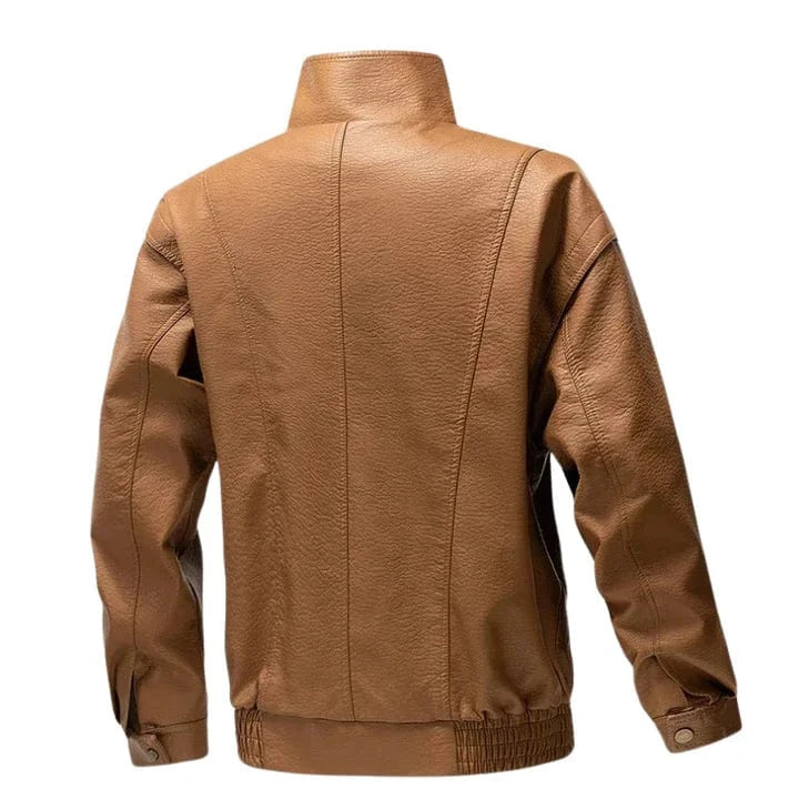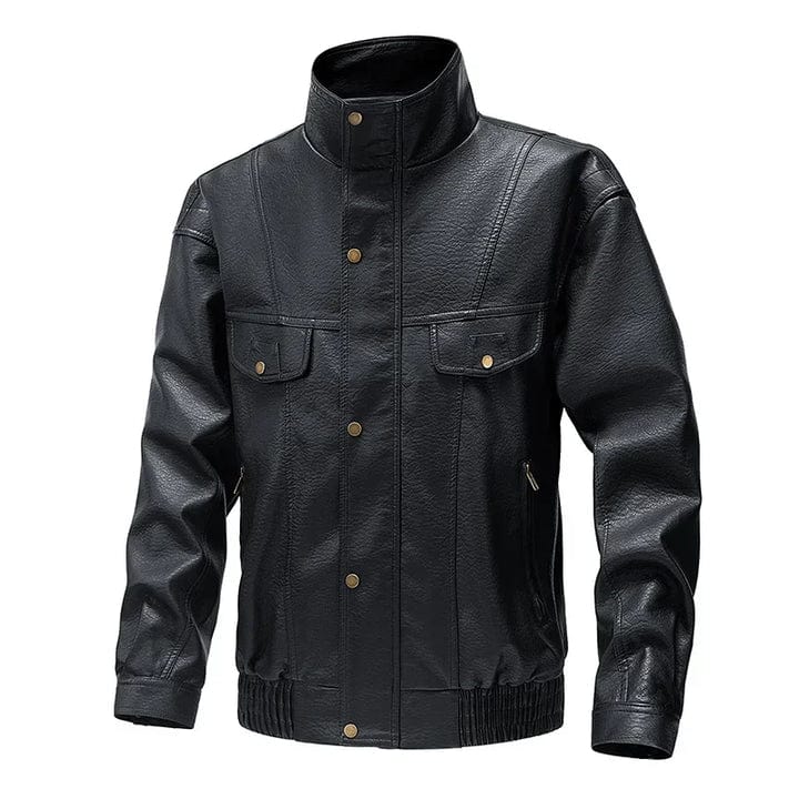 Crafted from premium leather, this jacket combines durability with a retro-inspired design. Featuring a stand-up collar, snap-button chest pockets, and zippered side details, it’s made for those who value confidence and individuality.