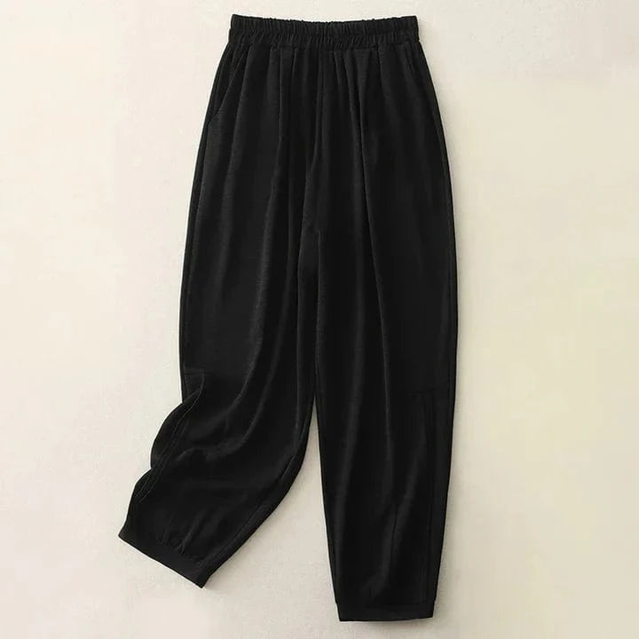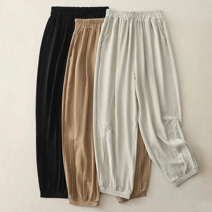 Woven from soft linen, these pants bring ease to everyday wear. A gentle drape flows from a gathered waist to tapered cuffs, finished with stitched side accents—crafted for quiet comfort and casual grace.