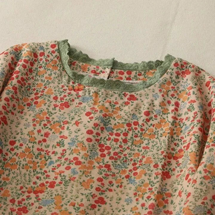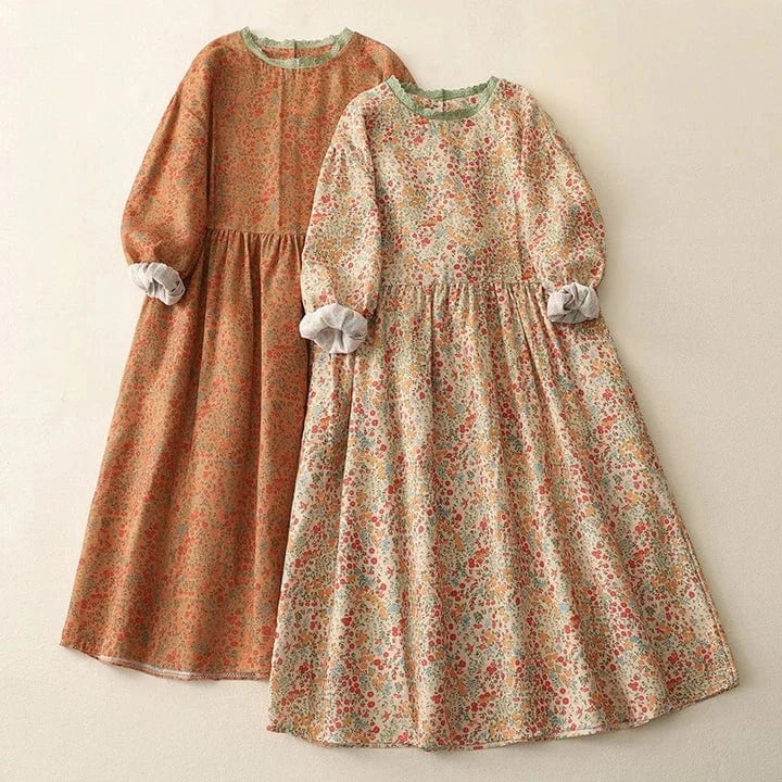 Rendered in gossamer linen, this dress gathers its charm in quiet volume and painterly bloom. Billowed sleeves taper into soft cuffs, while a ruched waist gently releases into a full, fluid skirt—shaped for meandering mornings and twilight reverie.