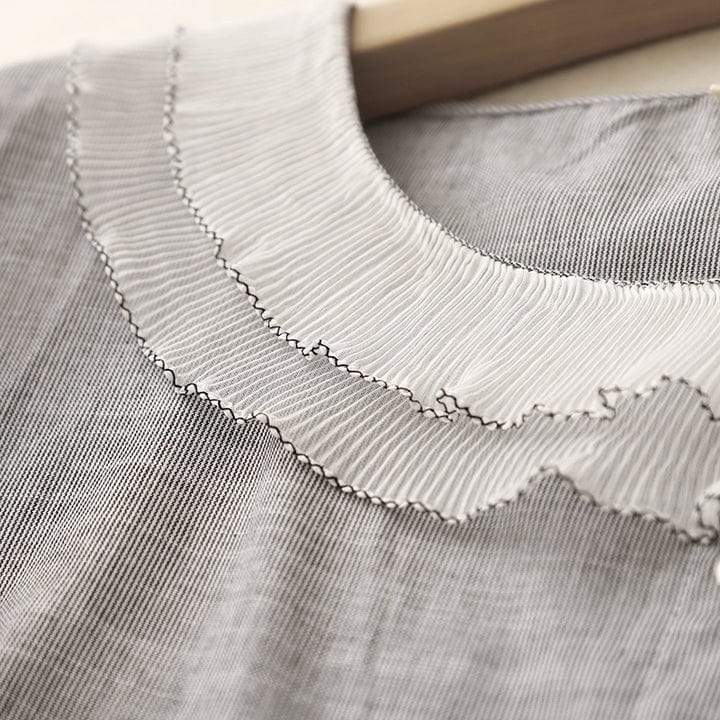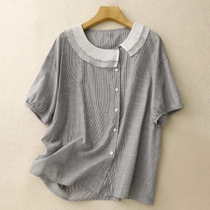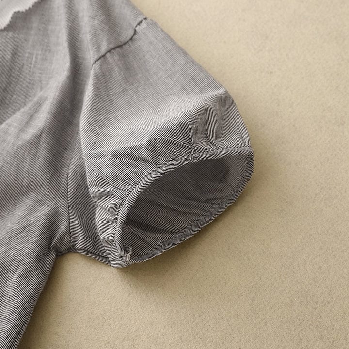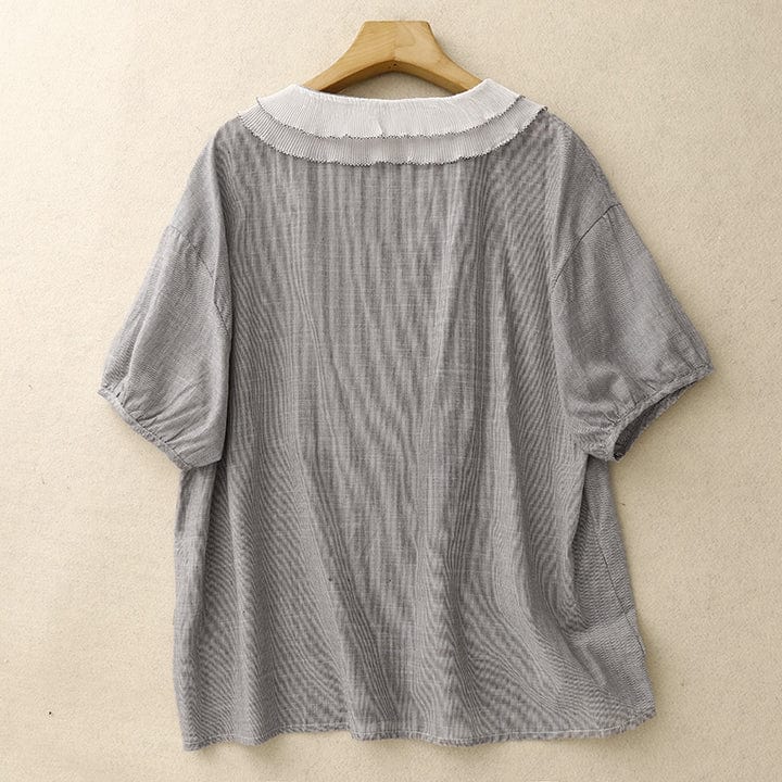 Woven from breathable linen, this striped blouse flows with a gentle drape and soft puffed sleeves. A pleated doll collar frames the neckline—stitched for days that bloom in quiet grace.