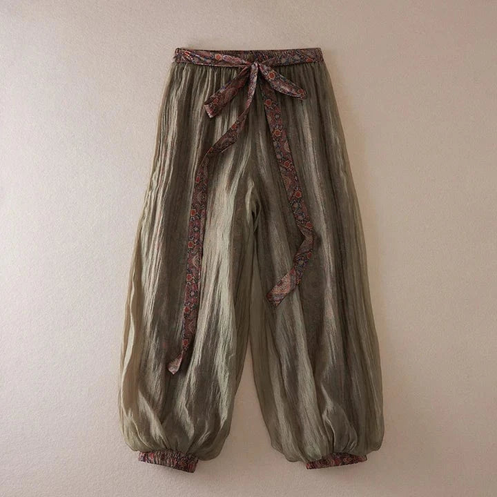 Woven from whisper-light gossamer linen, these pants float with a poetic ease. An elasticated waist and gently cinched cuffs lend volume to the silhouette, creating a subtle lantern shape that sways with intention. Artful and featherlight—tailored for daydreamers.