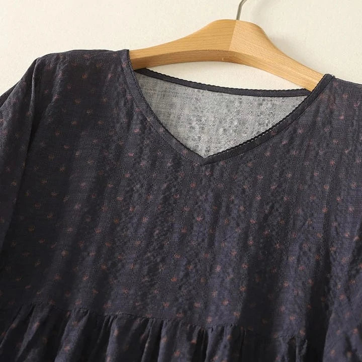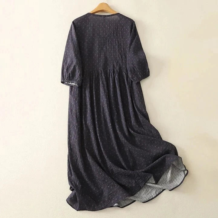 Woven from our signature Gossamer Linen, this dress falls with an air of quiet depth. Subtle texture whispers across a gathered skirt, while the V neckline and voluminous sleeves evoke grace with restraint. Finished with hidden pockets and a barely-there lining—crafted to move where the day drifts.