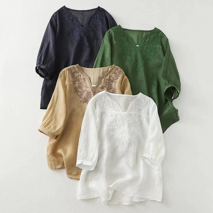 Woven from gossamer linen, this shirt evokes the romance of old-world craftsmanship. Delicate embroidery dances across the neckline, tracing a pattern of poetic nostalgia. The fluid silhouette and gentle structure promise movement, breathability, and intention—an artisan’s answer to the everyday blouse.